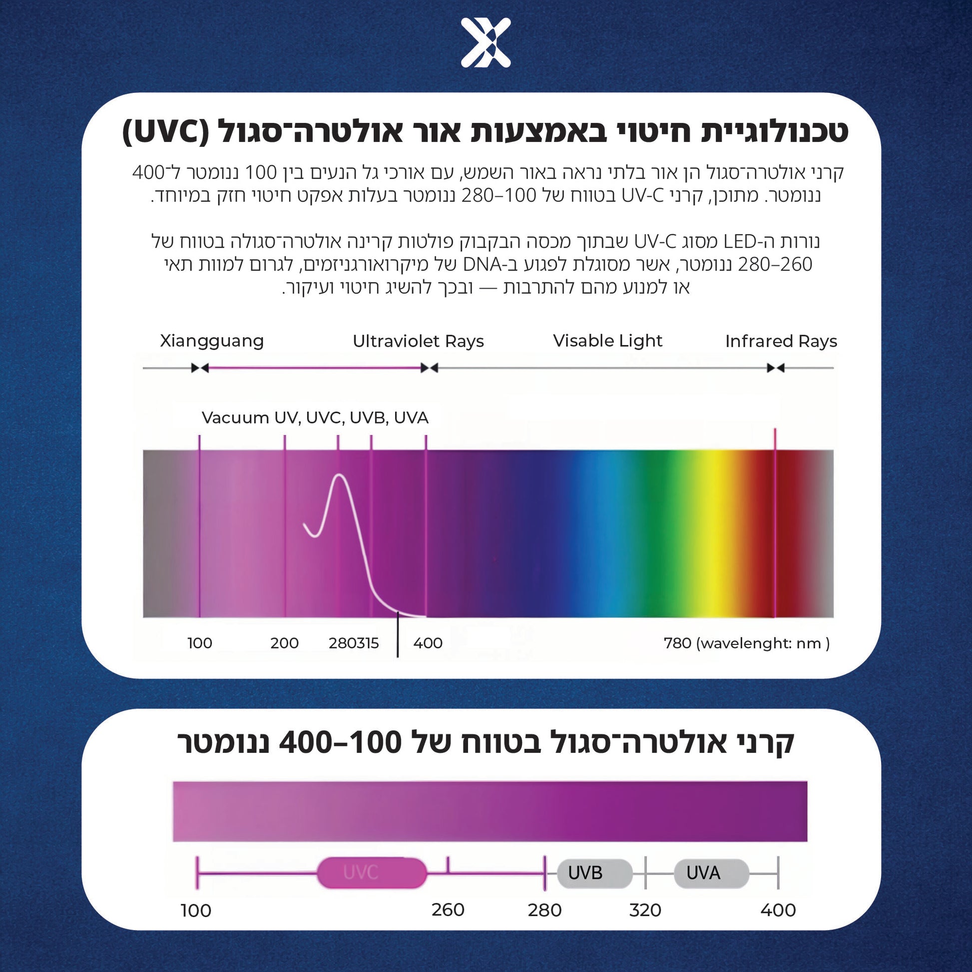 טכנולוגיית UV-C מנטרלת חיידקים על ידי פגיעה במבנה הגנטי (DNA) שלהם, ומונעת שכפול והתרבות