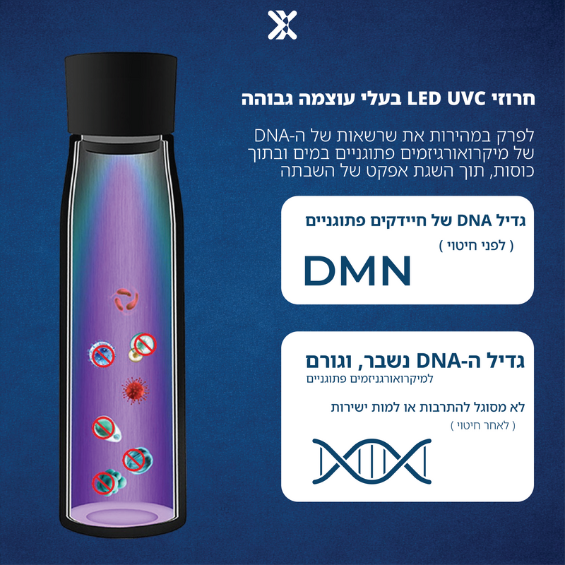 באמצעות טכנולוגיית UV-C מוכחת מדעית, הבקבוק פועל לנטרול חיידקים על־ידי פגיעה ישירה במבנה ה-DNA שלהם, ומסייע להפחית עד 99.99% מהחיידקים הנפוצים במים ובפנים הבקבוק — ללא פילטרים וללא כימיקלים.